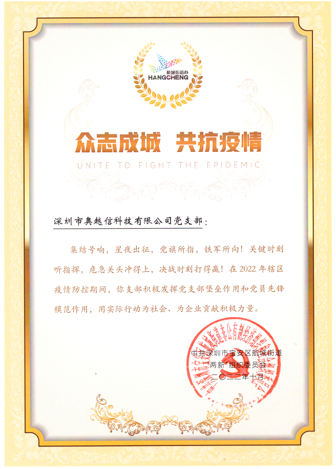 集结号响,星夜出征,党旗所指,铁军所向!关键时刻,听指挥,危机关头冲得上,决战时刻打得赢!在2022年辖区疫情防控期间,深圳市奥越信科技党支部积极发挥党支部堡垒作用和党员先锋模范作用,用实际行动为社会、为企业贡献积极力量。