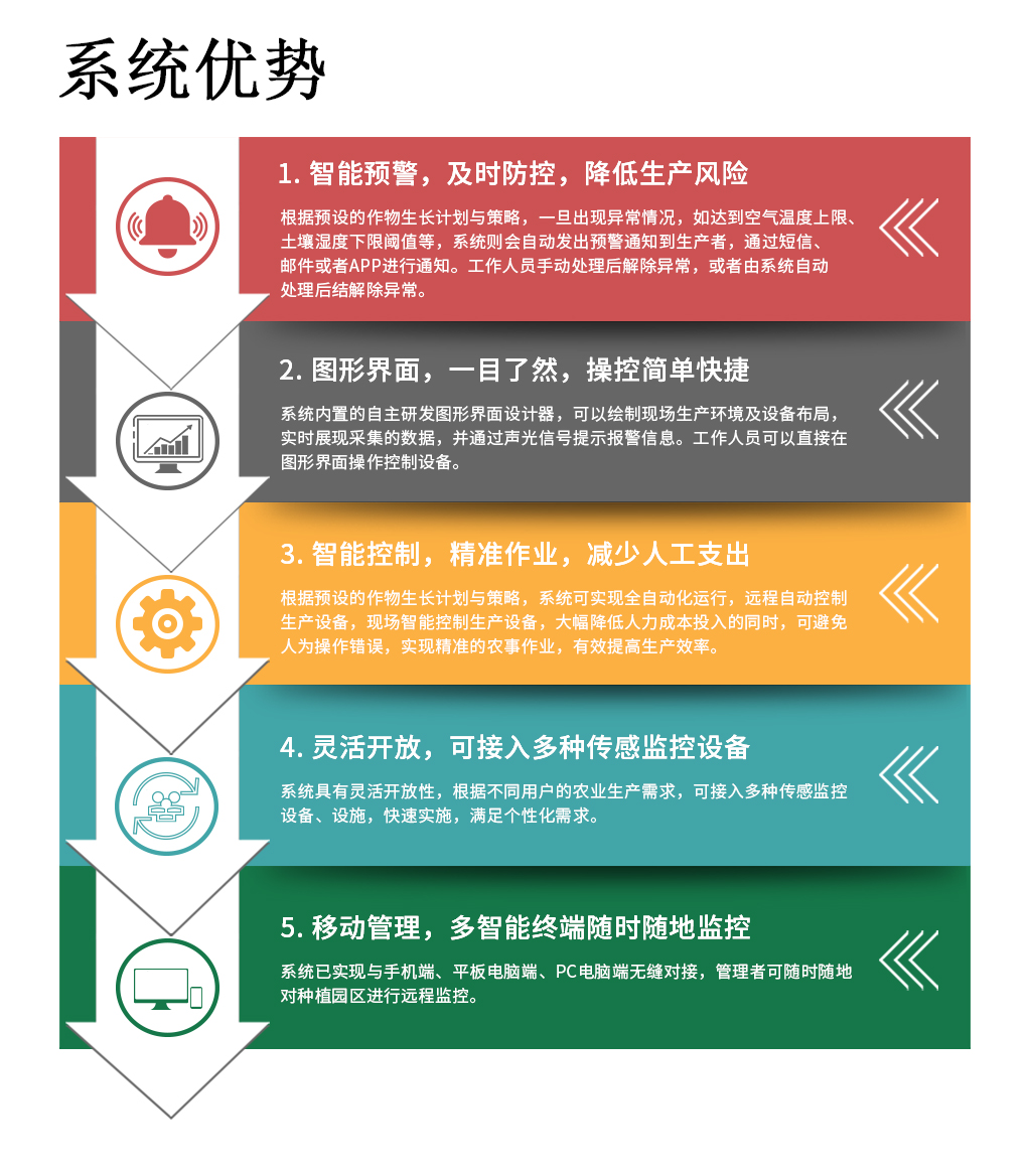 智慧农业云平台可远程获取现场环境(如温室大棚、稻田)的空气温湿度、土壤水分温度、二氧化碳浓度、光照强度及视频图像,通过数据模型分析,可以自动控制温室湿帘风机、喷淋滴灌、内外遮阳、顶窗侧窗、加温补光等设备;同时,还可以通过手机、触摸屏、计算机等信息终端向管理者推送实时监测信息、报警信息,实现现场环境的信息化、智能化远程管理。可减少人工成本,实现无人值守,精准调控,有效规避生产风险。